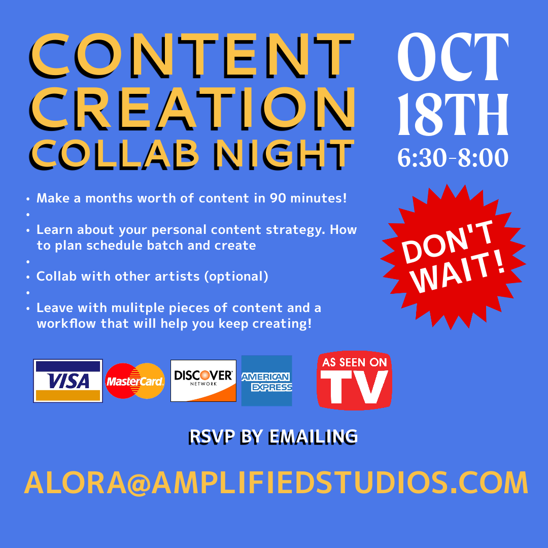 About the Event: Join us on Wednesday, October 14th, from 6:30 to 8:00 PM for a game-changing event designed especially for music artists like you! Are you feeling stuck when it comes to generating fresh content ideas? Look no further. Our event is your key to unlocking a world of creativity and efficiency. Discover the secrets of content batching, scheduling, creation, and marketing that will transform your online presence. Learn how to craft a content calendar that works for you, and, most importantly, get hands-on experience recording your content with our state-of-the-art facilities. The best part? You'll have the opportunity to collaborate with fellow artists, sharing ideas and experiences, and potentially creating exciting new projects together. Plus, you get to keep all the content you create. Imagine producing a month's worth of content in just 90 minutes! Don't miss this opportunity to supercharge your content game, elevate your music career, and connect with other passionate artists. Reserve your spot today and embark on a journey to content creation mastery.